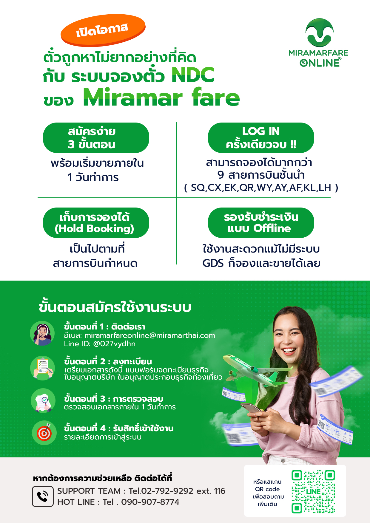 **สมัคร จอง และออกตั๋วบน “Miramar NDC” สายการบิน ต่อไปนี้ รับโปรโมชั่นทันที**